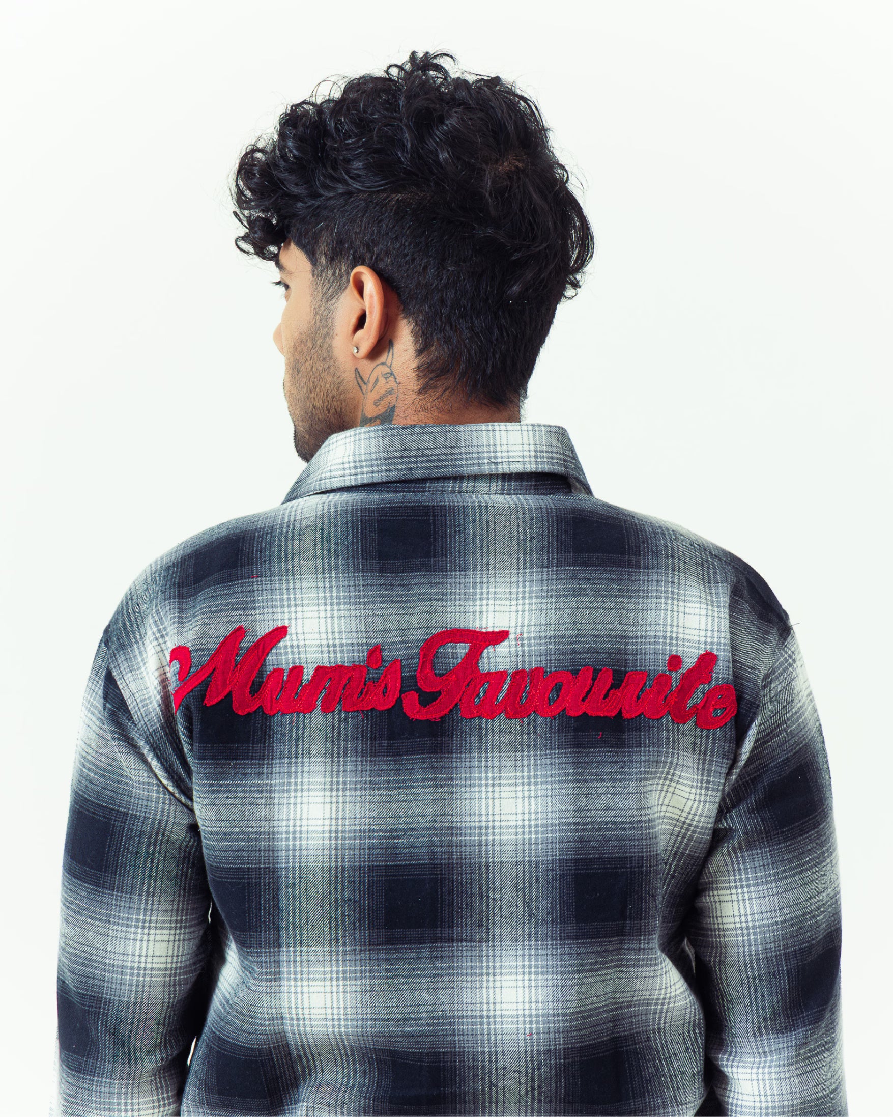 Warm flannel texture paired with a sharp Mum’s Favourite back print, blending comfort with personality in one piece.